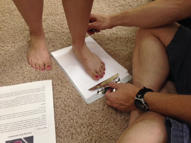As part of the fall half marathon training we offered a free gait and shoe evaluation with Tony for each registered participant. Each mom that signed up got 15-20 minutes one on one (well, two on one since I was there too) with Tony. He evaluated feet, marked them, watched them walk, checked out shoes and gave recommendations. Some were as simple as ‘keep doing what you are doing’ while others needed shoes changes and some were offered a custom orthotic. We really tried to educate each mom on her mechanics, her body, her shoes and to answer any and all questions. The main goal was to reduce injury and provide them with the resources to run a successful and easy half marathon.